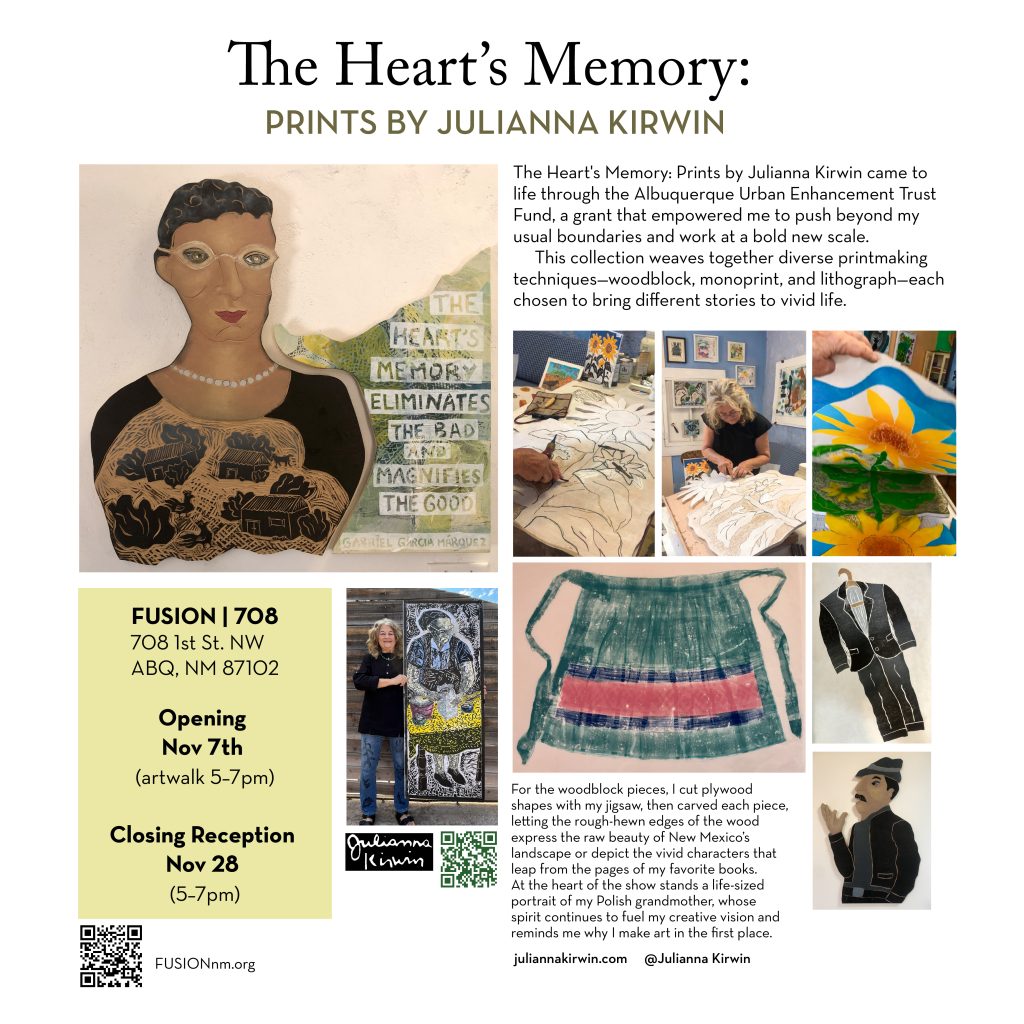My show, “The Heart’s Memory” will open at FUSION, 708 1st St. NW, Albuquerque 87102 on November 7th, 5-8pm. This show is thanks to a grant from the Albuquerque Urban Enhancement Trust Fund which supported my desire to develop a new body of work, larger in scale. I will be showing woodblock prints, monoprints and lithographs. Each of the woodblock prints were made from the plywood cut-outs, using my jigsaw, and each tells a story, such as the beauty of our New Mexico landscape, or the characters from some of my favorite books. My work would not be complete without an homage to my grandmother and my Polish heritage as seen in her life-sized portrait. The show will run until Nov. 28th.